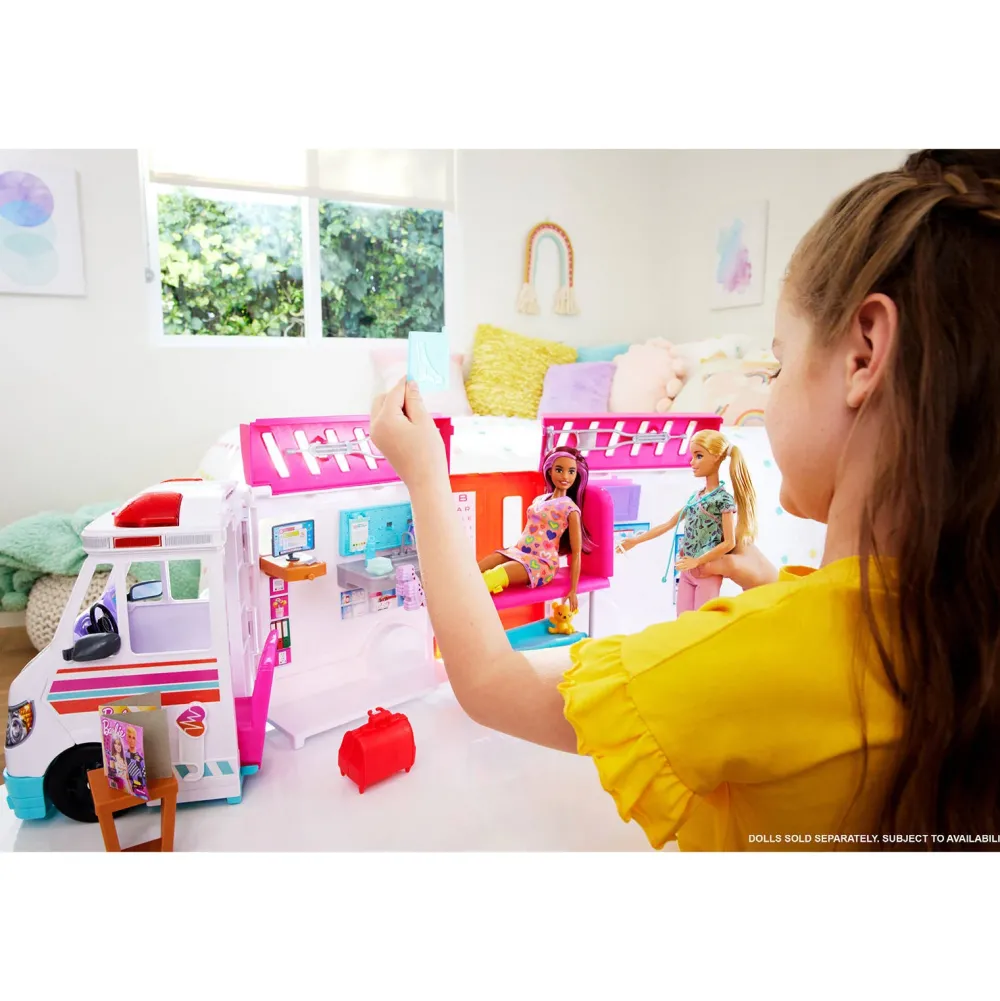 De Barbie Kliniek Speelset Laat Kids Hun Eigen Verzorgende Kant Als Medische Professional Verkennen. Het Kliniekvoertuig Kan Van Een Ambulance, Compleet Met Licht En Geluid, Worden Omgetoverd Tot Een Kantoor Van Een Arts, Met Een Onderzoekskamer En -Tafel, Een Receptie En Een Wachtruimte. Meer Dan 20 Accessoires Inspireren Kinderen Om Na Te Denken Over De Zorg Voor Patinten En Om Zelf Verhalen Rondom Dit Thema Te Bedenken. Pop Niet Inbegrepen. Kleuren En Versieringen Kunnen Varieren.