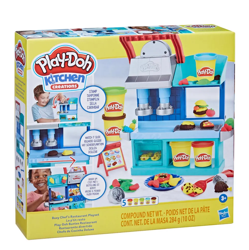 Met De Play-Doh Kitchen Creations Busy Chef’S Restaurant-Speelset Hebben Kinderen Het Gevoel Dat Ze Hun Eigen Restaurant Runnen: Ze Maken, Veranderen En Delen Play-Doh-Gerechten Met Ingebeelde Klanten! Kinderen Kunnen De Stempels Eenvoudig Bevestigen En Pizza, Hamburgers, Pasta Of Kip Namaken. Duw Op De Hendel Om 2 Namaakgerechten Tegelijkertijd Te Stempelen! Als Ze De Hendel Loslaten, Verschuift De Bakplaat Naar Het Bereidingsstation! Maak Toppings Voor Burgers, Fantastische Friet, Gekke Koekjes En Meer Namaakvoedsel Met De Halve Vormpjes Aan Beide Kanten Van Deze Kinderspeelset. Leg Ze Op Het Bord En Schuif Het Door Het Raam Om Je Vriendjes Te Laten Weten Dat De Bestelling Klaar Is! Laat Je Fantasie De Vrije Loop Met Het Mini-Menubord En Overige Keukenaccessoires. Dit Kookspeelgoed Voor Jongens En Meisjes Vanaf 3 Jaar Is Ideaal Als Cadeautje Voor Kinderen Die Dol Zijn Op Speelgoedvoedsel. Hasbro, Play-Doh En Alle Bijbehorende Kenmerken Zijn Handelsmerken Van Hasbro.