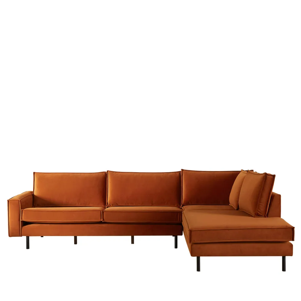 Deze Lexington Hoekbank Is Bekleed Een Heerlijk Zachte Velours Stof In Een Terracotta Kleur. De Chique Uitstraling Van Deze Stof En Terra Kleur Maken Deze Bank Een Echte Statement Piece. De Naar Buiten Gestikte Engelse Naden En Slanke Metalen Pootjes Geven Een Stoer Randje Aan Deze Chique Bank.
