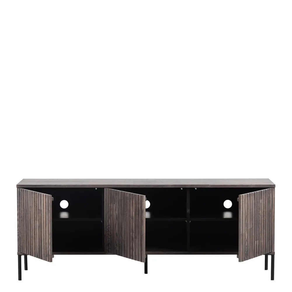 Het Gravure New Tv-Meubel Heeft Een Hoogte Van 56 Cm, Breedte Van 150 Cm En Een Diepte Van 44 Cm. De Drie Deuren Zijn Elk 37 Cm Hoog, 50 Cm Breed En 2 Cm Dik. Het Lijnenspel Op De Deurfronten Geeft De Gravure Zijn Aantrekkelijke, Herkenbare Uiterlijk. Achter De Drie Deuren Bevinden Zich Zes Afgeschermde Vakken Van 18X50X42 Cm (Hoogte X Breedte X Diepte). Het Metalen Onderstel Heeft Een Hoogte Van 15 Cm En Iedere Poot Is O 2 Cm. Achter Iedere Deur Is Een Cirkel Uitgevreesd Voor De Bedrading (O 50 Cm), Deze Is Vanaf De Grond Gemeten 40 Cm Hoog.
