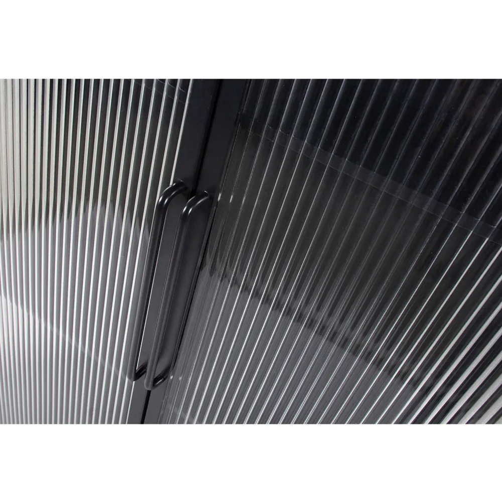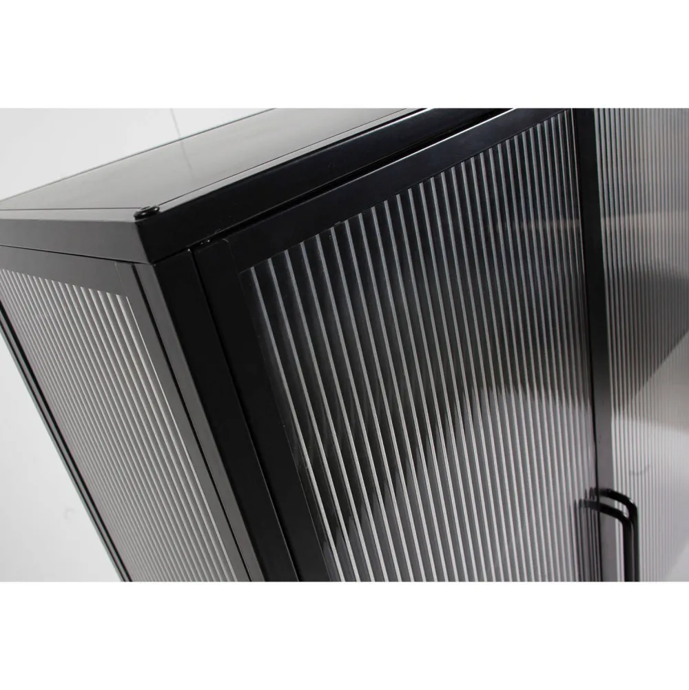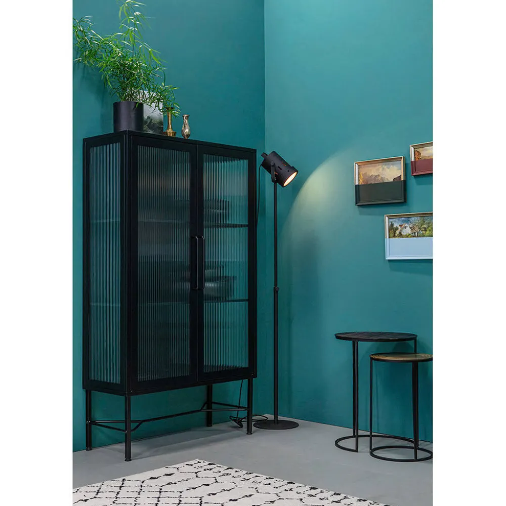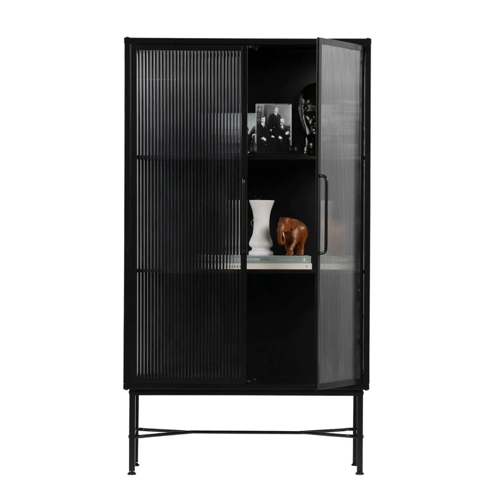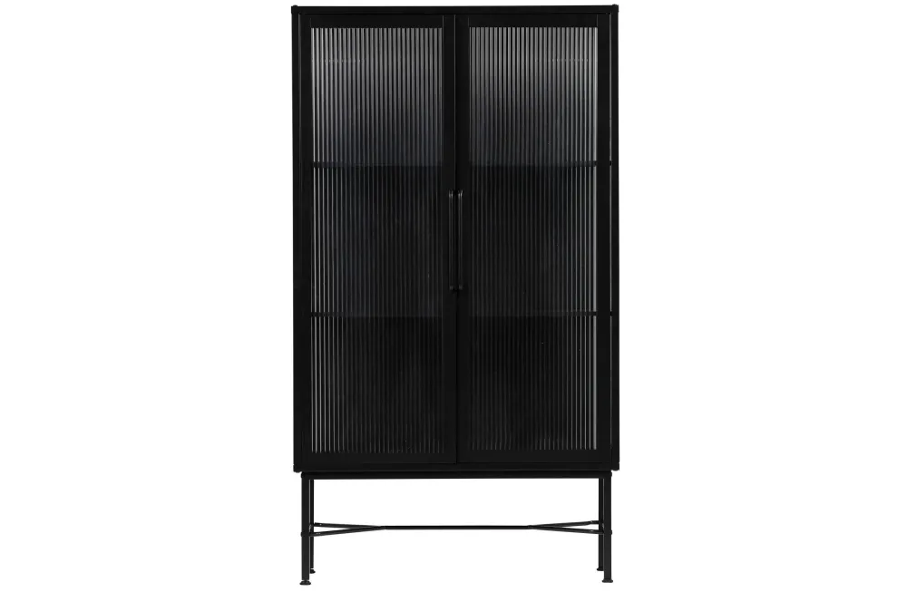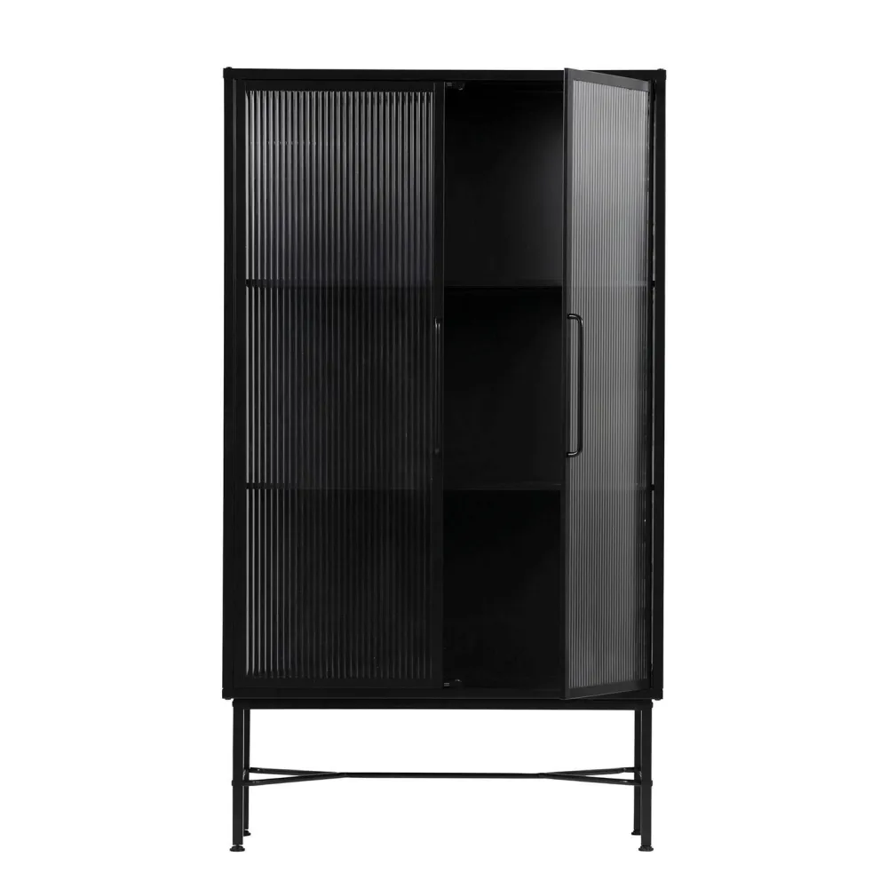 Vitrinekast Zion, Is Een Nederlands Ontwerp Uit De Collectie Van Woood Exclusive.Kast Zion, Met Een Diepte Van 35 Cm, Is Gemaakt Van Staal Dat Is Afgewerkt Met Een Matzwarte Poedercoating.De Kast Staat Op 30 Cm Hoge Poten, Met Een Dikte Van 2X2 Cm. De Deuren, (Hxb) 117X40 Cm, Van Deze Kast Zijn Uitgevoerd Met Safety Glass Met Een Ribstructuur. De Handgrepen Op De Deuren Hebben Een Hoogte Van 27 Cm En Een Diepte Van 3 Cm.De Legplanken (Hxbxd) 1X82,5X21 Cm Hebben Een Tussenruimte Van 38 Cm.