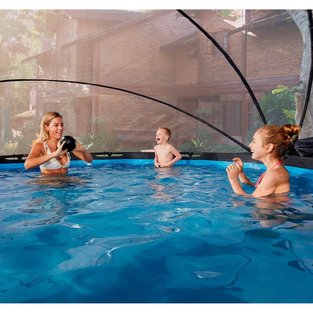 De Exit Zwembad Overkapping Is Een Multifunctionele Overkapping Voor Op Je Zwembad. De Overkapping Is Geschikt Voor Ronde Exit Zwembaden En Voor Veel Andere Frame Zwembaden. Met De Exit Overkapping Voor Zwembaden Ben Je Niet Langer Afhankelijk Van De Weersvoorspellingen En Heb Je Zelfs Met Minder Mooi Weer Plezier Van Je Zwembad. De Overkapping Is Tegelijkertijd Een Duurzame Oplossing Voor Het Verwarmen Van Het Water. Wanneer Het Zwembad Niet Wordt Gebruikt, Kun Je De Kap Met De Meegeleverde Banden Stevig Aan Het Bad Bevestigen. Zo Zorg Je Er Meteen Voor Dat Er Geen Vuil In Het Water Kan Komen. De Overkapping Is Snel Aan Het Frame Van Het Zwembad Te Bevestigen En Eenvoudig Te Openen En Sluiten Door Het Unieke Scharniermechanisme. De Kap Kan Zelfs Half Open Blijven Staan, Zodat Je Eenvoudig In En Uit Het Bad Kunt Stappen.