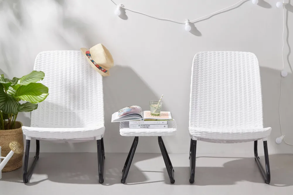 Deze Compacte Keter Rio Loungeset Past In Elke Tuin Of Op Ieder Balkon En Is Een Uitstekende Set Om Op De Zwoele Zomeravonden Heerlijk In Te Ontspannen. Het Achterover Hellende Zitvlak Zorgt Namelijk Voor Een Goed Zitcomfort. Het Loungesetje Bestaat Uit Twee Stoelen En Een Kleine Tafel En Is Snel En Eenvoudig Te Monteren. De Set Is Voorzien Van Een Modern Wicker Design. Het Kunststof Materiaal Zorgt Ervoor Dat De Set Onderhoudsvrij, Weerbestendig En Ontzettend Duurzaam Is. Deze Set Is Compact En Daarom Ideaal Voor Kleine Terrassen En Tuinen. U Kunt De Rio Patio Balkonset Dus Het Gehele Jaar Buiten Laten Staan.