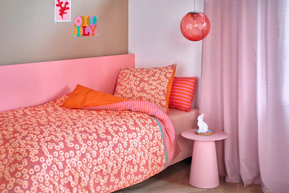 Kinderdekbedovertrek Molly Van Oilily Is Een Kleurrijk, Vrolijk Dessin, Dat Bestaat Uit Kleine Getekende Bloemetjes. De Kleine Getekende Bloemetjes Die Zijn Afgebeeld Zijn Schattige Madeliefjes. Deze Worden Op Speelse Wijze Gecombineerd Met Een Gestreepte Bovenkant In Roze En Oranje. De Achterkant Van Het Dekbedovertrek En Het Kussensloop Zijn Oranje, Wat Een Mooi Contrast Vormt Met De Vrolijke Kleuren Aan De Voorkant. Een Leuke Toevoeging Aan Iedere Kinderkamer!