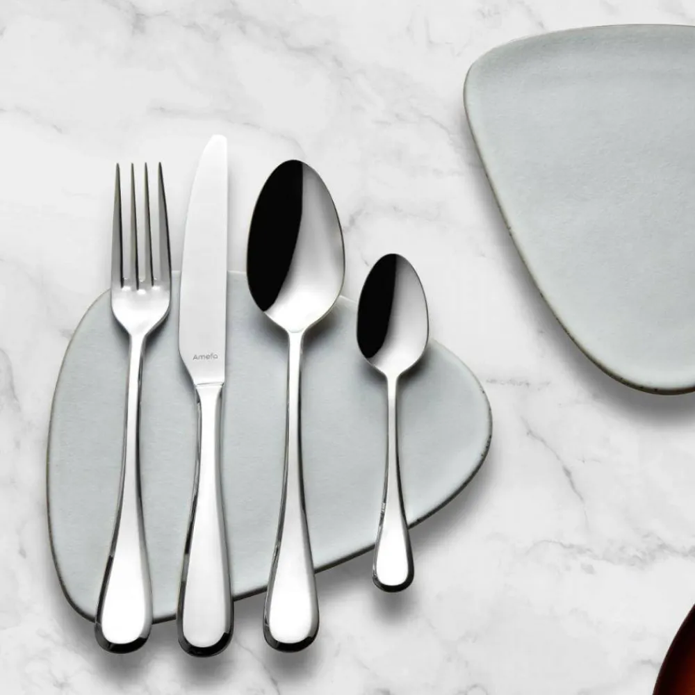 Het Drift Bestek Heeft Een Druppelvormig En Aan De Zijkanten Schuin Aflopend Heft. Door De Vloeiende Lijnen Ligt Het Bestek Comfortabel In De Hand. Amefa Drift Is Een Model Uit Het Premiere Assortiment, In Dit Assortiment Wordt Kwaliteit Gecombineerd Met Exclusieve Designs En Functionaliteit.