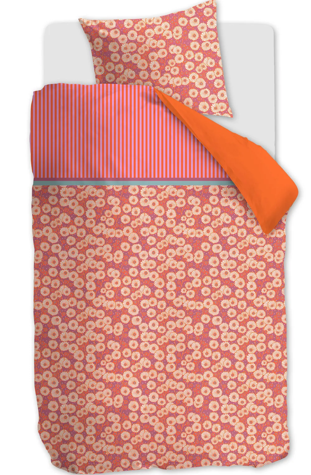 Kinderdekbedovertrek Molly Van Oilily Is Een Kleurrijk, Vrolijk Dessin, Dat Bestaat Uit Kleine Getekende Bloemetjes. De Kleine Getekende Bloemetjes Die Zijn Afgebeeld Zijn Schattige Madeliefjes. Deze Worden Op Speelse Wijze Gecombineerd Met Een Gestreepte Bovenkant In Roze En Oranje. De Achterkant Van Het Dekbedovertrek En Het Kussensloop Zijn Oranje, Wat Een Mooi Contrast Vormt Met De Vrolijke Kleuren Aan De Voorkant. Een Leuke Toevoeging Aan Iedere Kinderkamer!