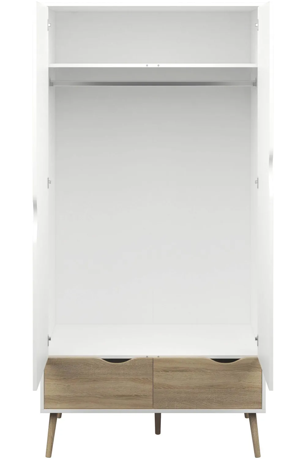 Deze 2 Deurs Kledingkast Oslo Heeft Een Mooi Scandinavisch Design. De Kast Is Gemaakt Van Spaanplaat Met Folie. Het Frame En De Deuren Hebben Een Witte Kleur. De Lades En Poten Zijn In De Kleur Eiken. De Indeling Van De Kast Bestaat Uit Een Hanggedeelte Over De Breedte Van De Kast Met Daarboven Een Legplank. Kledingkast Oslo Staat Op Poten Die Schuin Naar Buiten Geplaatst Zijn.