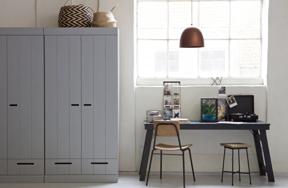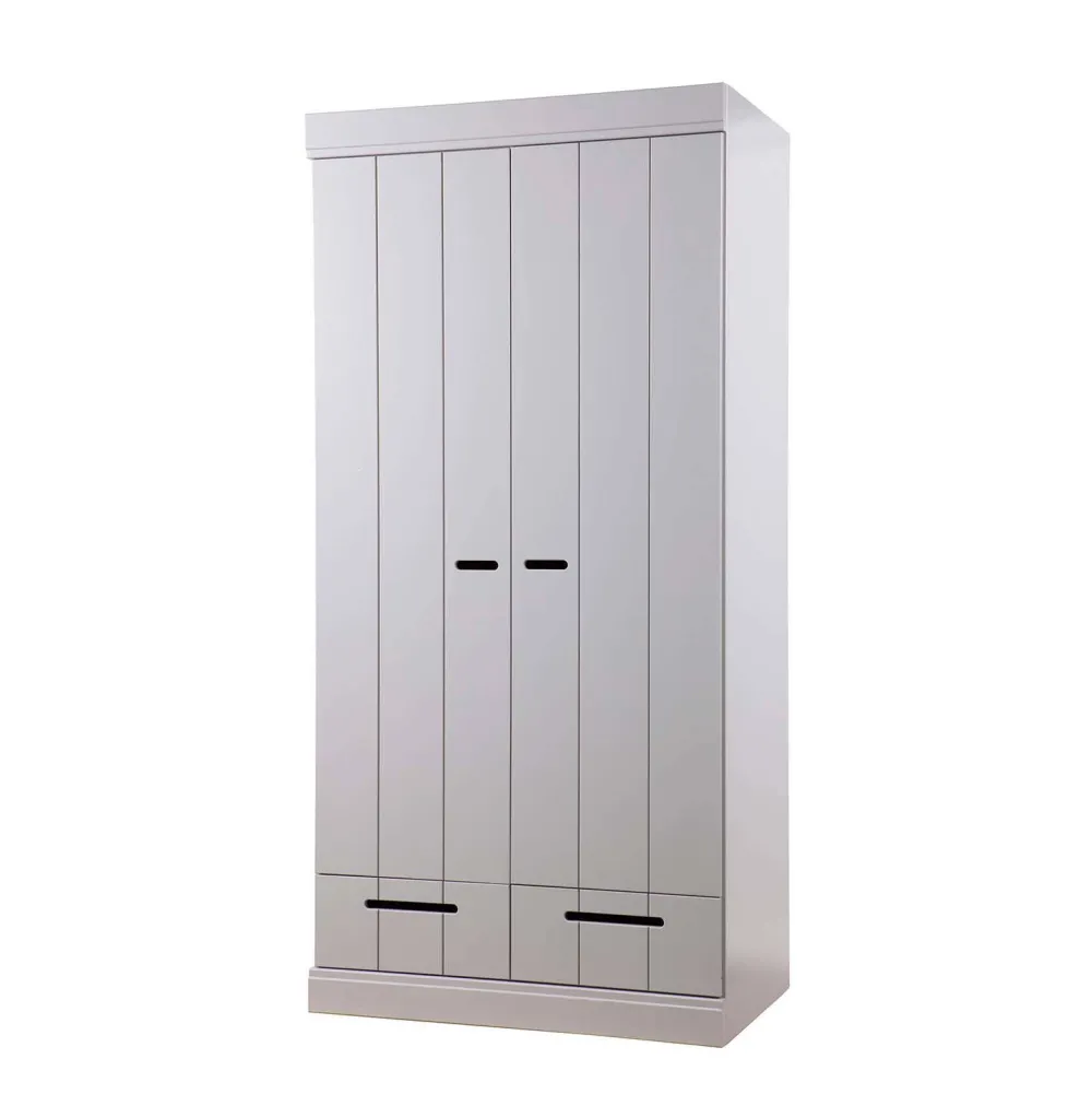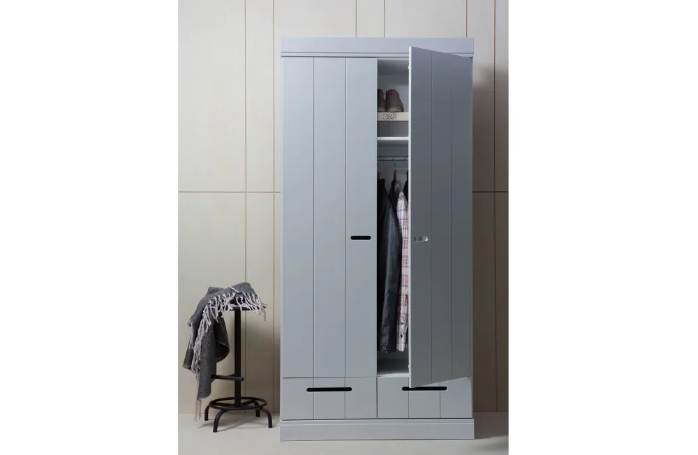 Een Ruime, Stoere Kast Dat Is Deze Connect 2-Deurs Kast Met Lade En Strokendeur Met Sleufgreep Uit De Collectie Van Het Nederlandse Merk Woood. De Romp Van De Connect 2-Deurs Kast Is Gemaakt Van Massief, Fsc Gecertificeerd, Grenenhout Met Een Beton Grijze Afwerking. De Binnenzijde Is Voorzien Van Gelamineerde Legplanken, Praktisch Met Schoonmaken. De Connect 2-Drs Kast Wordt Standaard Geleverd Met Hanggedeelte En 1 Legplank Over De Gehele Breedte Van De Kast.