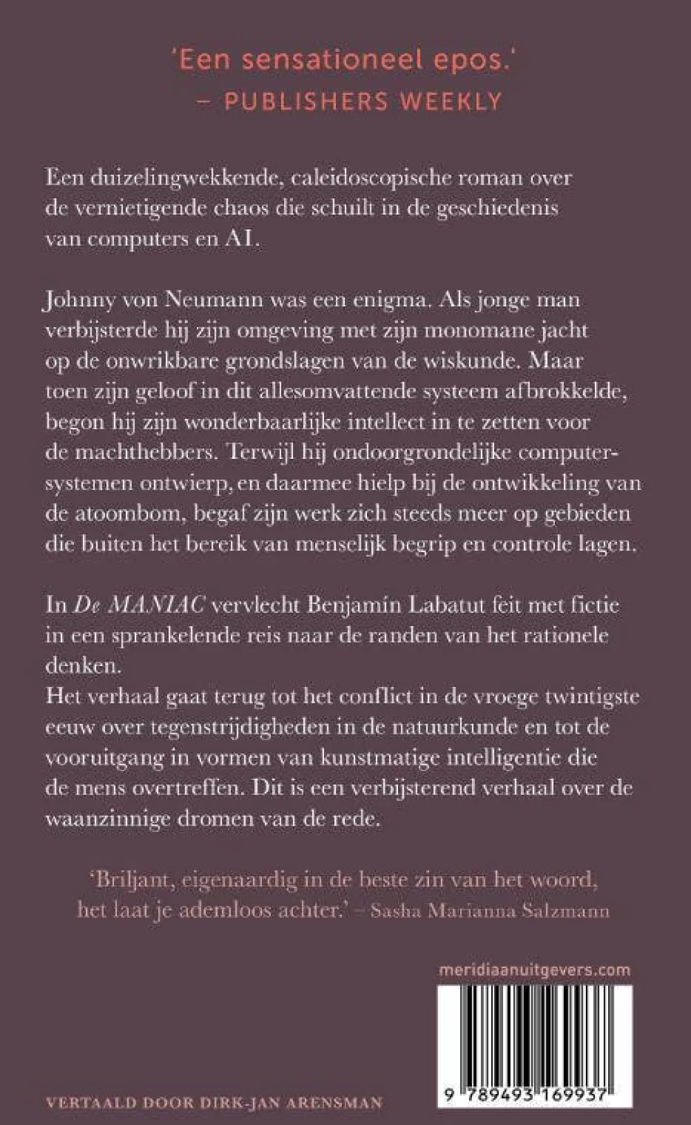 ‘Monsterlijk Goed. (…) Leest Als De Duistere Ontstaansmythe Over Moderne Technologie, Maar Met Het Tempo Van Een Thriller.’ – Mark Haddon‘Een Sensationeel Epos.’– Publishers Weeklyeen Duizelingwekkende, Caleidoscopische Roman Over De Vernietigende Chaos Die Schuilt In De Geschiedenis Van Computers En Ai. Johnny Von Neumann Was Een Enigma. Als Jonge Man Verbijsterde Hij Zijn Omgeving Met Zijn Monomane Jacht Op De Onwrikbare Grondslagen Van De Wiskunde. Maar Toen Zijn Geloof In Dit Allesomvattende Systeem Afbrokkelde, Begon Hij Zijn Wonderbaarlijke Intellect In Te Zetten Voor De Machthebbers. Terwijl Hij Ondoorgrondelijke Computersystemen Ontwierp, En Daarmee Hielp Bij De Ontwikkeling Van De Atoombom, Begaf Zijn Werk Zich Steeds Meer Op Gebieden Die Buiten Het Bereik Van Menselijk Begrip En Controle Lagen.In De Maniac Vervlecht Benjamin Labatut Feit Met Fictie In Een Sprankelende Reis Naar De Randen Van Het Rationele Denken. Het Verhaal Gaat Terug Tot Het Conflict In De Vroege Twintigste Eeuw Over Tegenstrijdigheden In De Natuurkunde En Tot De Vooruitgang In Vormen Van Kunstmatige Intelligentie Die De Mens Overtreffen. Dit Is Een Verbijsterend Verhaal Over De Waanzinnige Dromen Van De Rede.