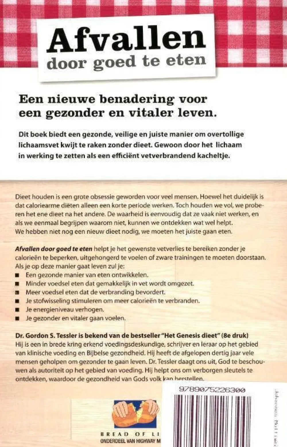 Een Nieuwe Benadering Voor Een Gezonder En Vitaler Leven.Dit Boek Biedt Een Gezonde, Veilige En Juiste Manier Om Overtollige Lichaamsvet Kwijt Te Raken Zonder Dieet. Gewoon Door Het Lichaam In Werking Te Zetten Als Een Efficient Vetverbrandend Kacheltje.Dieet Houden Is Een Grote Obsessie Geworden Voor Veel Mensen. Hoewel Het Duidelijk Is Dat Caloriearme Dieten Alleen Een Korte Periode Werken. Toch Houden We Vol, We Proberen Het Ene Dieet Na Het Andere. De Waarheid Is Eenvoudig Dat Ze Vaak Niet Werken, En Als We Eenmaal Begrijpen Waarom Niet, Kunnen We Ontdekken Wat Wel Helpt.We Hebben Niet Nog Een Nieuw Dieet Nodig, We Moeten Het Juiste Gaan Eten.Afvallen Door Goed Te Eten Helpt Je Het Gewenste Vetverlies Te Bereiken Zonder Je Calorieen Te Beperken, Uitgehongerd Te Voelen Of Zware Trainingen Te Moeten Doorstaan.Als Je Op Deze Manier Gaat Leven Zul Je:* Een Gezonde Manier Van Eten Ontwikkelen.* Minder Voedsel Eten Dat Gemakkelijk In Vet Wordt Omgezet.* Meer Voedsel Eten Dat De Verbranding Bevordert.* Je Stofwisseling Stimuleren Om Meer Calorieen Te Verbranden.* Je Energieniveau Verhogen.* Je Gezonder En Vitaler Gaan Voelen.Dr. Gordon S. Tessler Is Bekend Van De Bestseller “Het Genesis Dieet” (8E Druk)