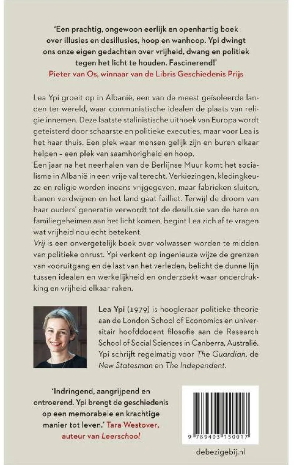 Lea Ypi Groeit Op In Albanie, Een Van De Meest Geisoleerde Landenter Wereld, Waar Communistische Idealen De Plaats Van Religieinnemen. Deze Laatste Stalinistische Uithoek Van Europa Wordtgeteisterd Door Schaarste En Politieke Executies, Maar Voor Leais Het Haar Thuis. Een Plek Waar Mensen Gelijk Zijn En Burenelkaar Helpen – Een Plek Van Saamhorigheid En Hoop.Een Jaar Na Het Neerhalen Van De Berlijnse Muur Komt Het Socialismein Albanie In Een Vrije Val Terecht. Verkiezingen, Kledingkeuzeen Religie Worden Ineens Vrijgegeven, Maar Fabriekensluiten, Banen Verdwijnen En Het Land Gaat Failliet. Terwijl Dedroom Van Haar Ouders’ Generatie Verwordt Tot De Desillusie Vande Hare En Familiegeheimen Aan Het Licht Komen, Begint Leazich Af Te Vragen Wat Vrijheid Nou Echt Betekent.Vrij Is Een Onvergetelijk Boek Over Volwassen Worden Te Middenvan Politieke Onrust. Ypi Verkent Op Ingenieuze Wijze De Grenzenvan Vooruitgang En De Last Van Het Verleden, Belicht De Dunnelijn Tussen Idealen En Werkelijkheid En Onderzoekt Waar Onderdrukkingen Vrijheid Elkaar Raken.